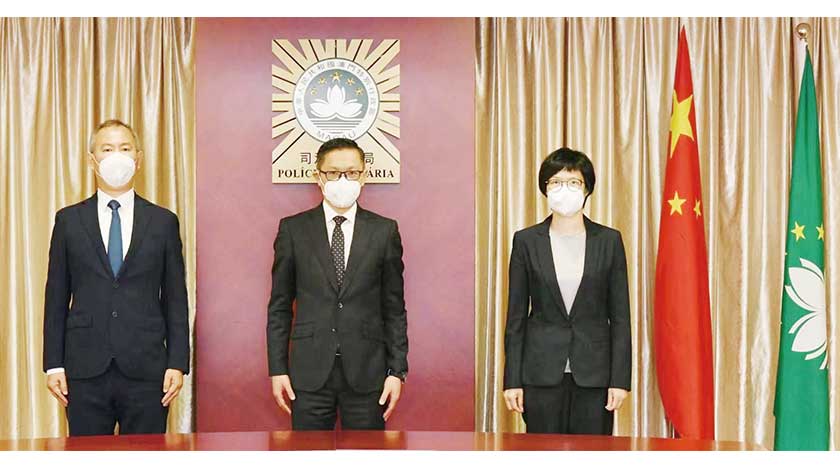 【特訊】為確保部門運作,昨,司法警察局在嚴格遵守衛生當局防疫指引下舉行了副局長就職儀式(見圖)。在司法警察局局長薛仲明監誓、副局長杜淑森及相關部門主管的見證下,梁文照督察長宣誓就任司法警察局副局長。