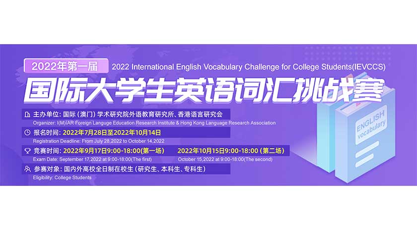 【特訊】為貫徹落實教育部《關於加快建設高水準本科教育全面提高人才培養能力的意見》等文件精神,國際(澳門)學術研究院外語教育研究所與香港語言研究會聯合舉辦“2022年第一屆國際大學生英語詞匯挑戰賽”(2022InternationalEnglishVocabularyChallengeforCollegeStudents簡稱IEVCCS)。