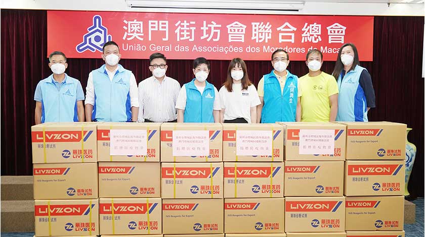 【特訊】澳門增城同鄉聯誼會為支持街坊總會的抗疫工作,7月27日吳穎芝副會長兼秘書長、孫嘉鳴副會長及胡寶權副會長及代表毛彩鳳會長向街坊總會捐贈LIVZON RAPID TEST FOR SARS-COV-2 ANTIGEN (LATERAL FLOW) 抗原檢測盒套裝24680盒,分別為一人份包裝的15080盒及二十人份包裝的9600盒,由街坊總會會長吳小麗、街坊總會副會長何潤生、街坊總會理事長陳家良、街坊總會副理事長兼秘書長莫偉成及街坊總會社會服務辦公室副總監張婉思接收。