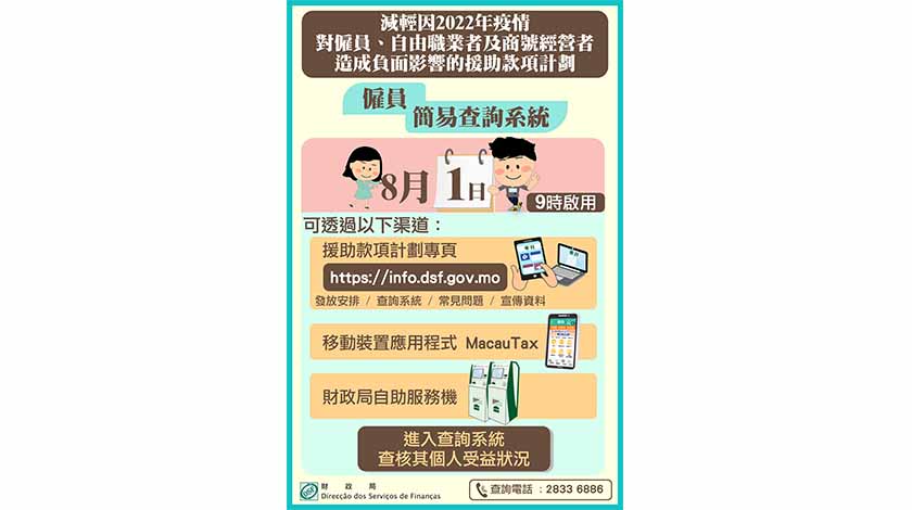 僱員簡易查詢系統同步於今日上午9時啟用,居民可透過專頁、Macau Tax移動應用程式、財政局自助服務機等多種途徑,進入查詢系統。援助款項於8月17日起分批發放,時間充裕,居民毋須急於查詢。
