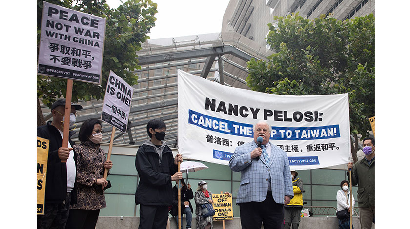 當地時間8月1日,美國加州舊金山民眾聚集在舊金山聯邦大樓前,反對美國眾議院議長佩洛西竄訪台灣。 中新社
