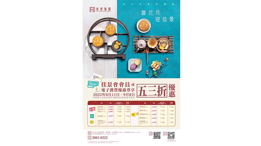 還有陪伴無數澳門人成長的經典月餅系列;表達層層美意的潮州月餅系列;大人小朋友都喜愛的流心奶黄月餅,傳統新派兼備,滿足不同味蕾,送禮自用兩相宜。由8月11日起凡佳景會會員或使用電子消費優惠計劃於佳景集團各月餅銷售門店購買佳景月餅,即享53折優惠,每購滿10盒再送$100餐飲現金券。數量有限,售完即止。