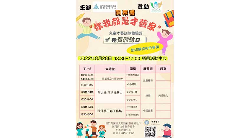【特訊】由街坊總會栢蕙活動中心主辦,市政署贊助,《你我都是才藝家》兒童才藝訓練營開幕禮(體驗日),將於本月28日下午二時在栢蕙活動中心舉行,活動目的是推廣兒童才藝技能,加強兒童才藝培訓及技能提升,為澳門培養才藝幼苗出一分力;共建澳門美好才藝氣息。