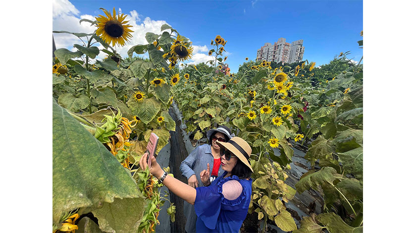 台北市北投奇岩重劃區內有一座向日葵花田,由台灣農業創新推展協會從德國引進1000株特殊品種向日葵,吸引不少民眾到場參觀拍照(香港中通社)
