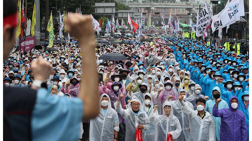 8月13日,集會者在韓國首爾市中心參加反美集會。據韓國《朝鮮日報》16日報道,韓國全國民主勞動組合總聯盟下屬組織“統一先鋒隊”日前在韓國各地駐韓美軍基地接連舉行集會,要求駐韓美軍撤離韓國。新華社