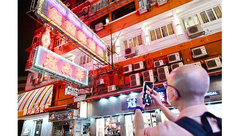 香港油麻地冠南華霓虹招牌清拆在即,市民8月16日晚上到油麻地冠南華店舖前拍攝霓虹招牌留念。冠南華於香港經營掛裙業務超過60年,特區政府立法規管招牌安全,舊式不合規格的霓虹招牌須清拆。圖為市民拍攝油麻地冠南華的霓虹招牌。(中新社)