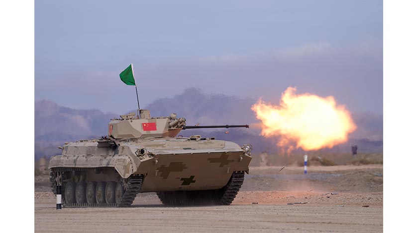 8月21日,“國際軍事比賽—2022”中國庫爾勒賽區進行“蘇沃洛夫突擊”項目接力賽。中國參賽隊以優異的競技水平、默契的協同配合取得第一名的成績,並創造“蘇沃洛夫突擊”接力賽歷史最好戰績。圖為中國參賽車組進行實彈射擊。 中新社