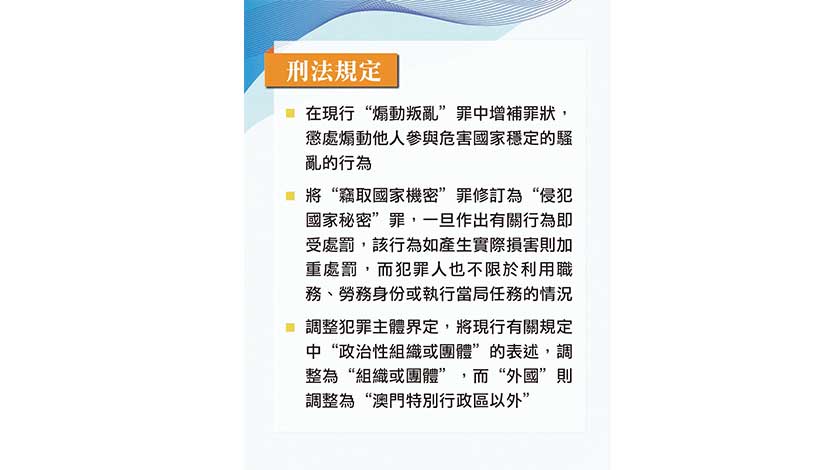《基本法》只是禁止澳門的政治性組織或團體與外國的性政治組織或團體建立聯繫。現行《維護國家安全法》也規定,「澳門的政治性組織或團體的機關或其人員以該本地組織或團體的名義並為其利益與外國的政治性組織或團體建立聯繫」,作出危害國家安全的行為,才受處罰。不過,政府在今次修法建議,不是政治性團體的任何個人、組織或團體作出危害國家行為,都受制裁。