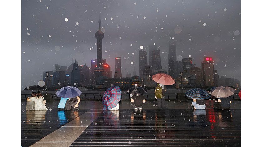 9月4日,遊客冒雨在上海外灘濱江步道上拍照。當日18時00分上海中心氣象台更新台風藍色預警信號為台風黃色預警信號。上海市綠化市容局9月3日發佈了便民提示,受『軒嵐諾』影響,9月4日晚間上海市暫停開放景觀照明。 中新社