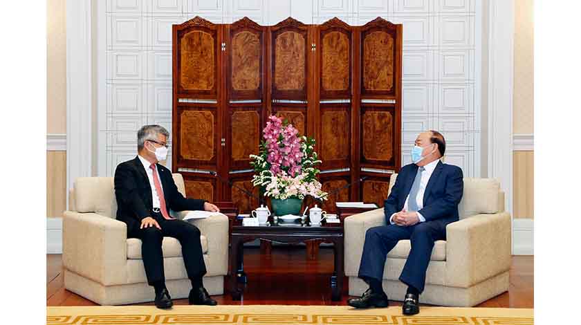 【特訊】行政長官賀一誠昨日在政府總部會見中國銀行副行長林景臻一行(見圖),雙方就澳門債券市場發展、橫琴粵澳深度合作區建設以及疫情期間澳門民生保障工作等議題進行交流。