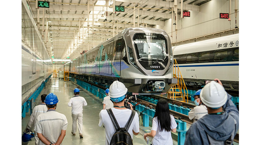 9月19日,四川成都,成都軌道交通19號線二期列車正式亮相。列車全長95.8米,寬3米,定員載客量1004人,最大載客量1416人,最高時速160公里。圖為列車吸引參觀者。 中新社
