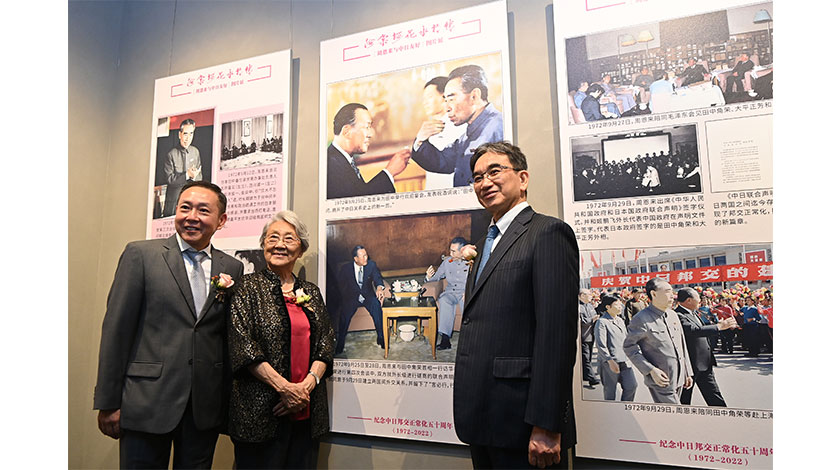 9月26日,為紀念中日邦交正常化50周年,『海棠櫻花永相傳——周恩來與中日友好』圖片展在北京和日本首都東京同期首展開幕。首展之後,該展覽將在中國淮安和日本京都、中國廣州和日本仙台同期展出。圖為北京會場內,周恩來侄女、北京大鸞翔宇慈善基金會創始會長周秉德(左二),日本駐華大使垂秀夫(右一)等在反映1972年周恩來總理歡迎日本首相田中角榮訪華等內容的展板前合影。中新社
