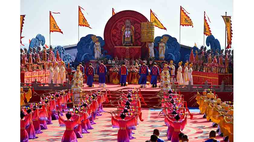 10月4日,農曆九月初九,“媽祖故里”福建省湄洲島舉行盛大的媽祖羽化昇天1035周年秋祭活動,來自美國、加拿大、越南、智利、菲律賓、柬埔寨、澳大利亞等23國,中國台灣及港澳地區的多家媽祖文化機構代表相聚湄洲共襄盛舉。圖為海祭媽祖大典現場。 中新社