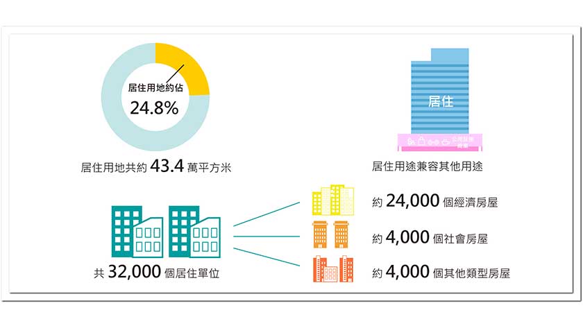 「東區-2」詳細規劃草案的公開諮詢文本提出,「東區-2」的居住用地面積共約四十三萬四千平方米,約佔區內總用地面積的百分之二十四點八,同時可用作與居住用途兼容的其他用途,尤其用作零售、餐飲及辦公室用途。
