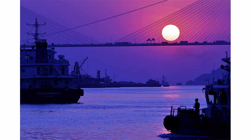 傍晚時分,香港荃灣海濱聚了大批攝影愛好者,一同拍攝汀九橋落日(中通社)