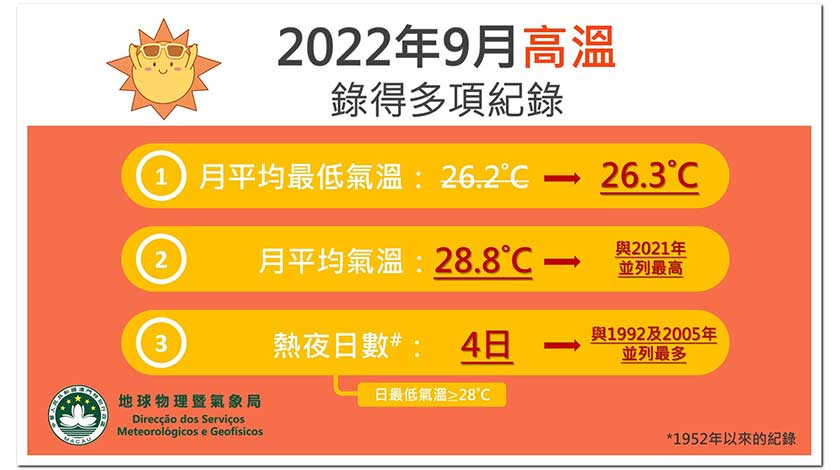 【本報訊】氣象局發布氣候資訊指,過去的九月,本澳錄得月平均氣溫為28.8˚C;月平均最低氣溫26.3 ˚C;熱夜日數(日最低氣溫≥28˚C)為4日,上述三項數據均為氣象局自1952年成立以來錄得的九月份最高紀錄(見圖表)。