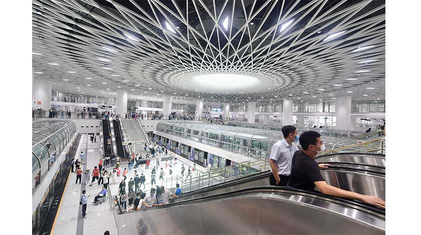 10月28日,深圳地鐵14號線、11號線福崗區間以及崗廈北樞紐、黃木崗樞紐、大運樞紐同時開門迎客。其中,地鐵14號線全長50.3公里,共設車站18座,途經福田、羅湖、龍崗、坪山四區。圖為崗廈北樞紐『深圳之眼』。 中新社