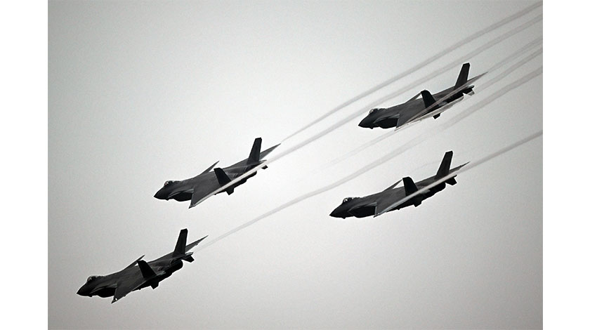 11月5日,參加第十四屆中國航展的中國空軍殲-20飛機多機編隊進行適應性飛行訓練。 新華社