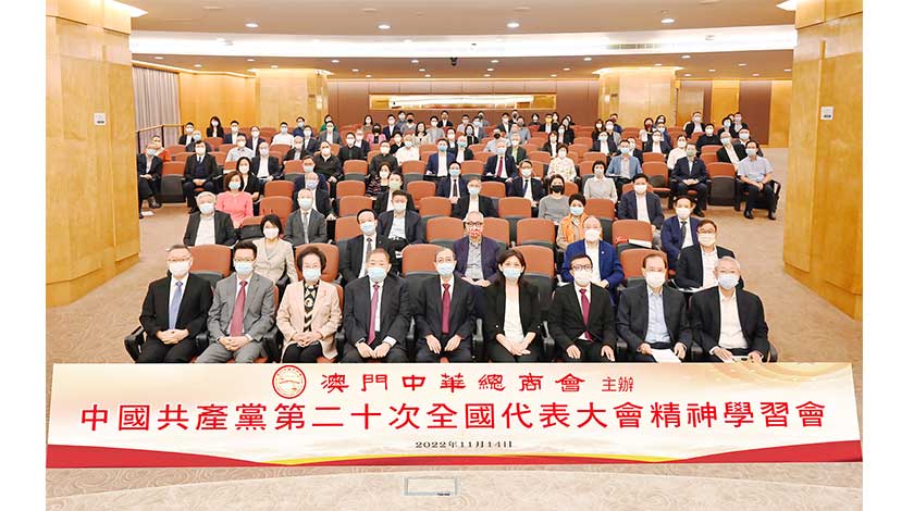 【特訊】澳門中華總商會昨(14)日在會址四樓何賢先生紀念堂舉行中國共產黨第二十次全國代表大會精神學習會,中央人民政府駐澳門聯絡辦公室協調部副部長仇昱應邀出席分享二十大精神。出席座談會的有該會永遠會長馬有禮、會長崔世昌、副會長賀定一、理事長馬志毅、監事長姜壹盛、副理事長崔世平及劉藝良等一百五十人。