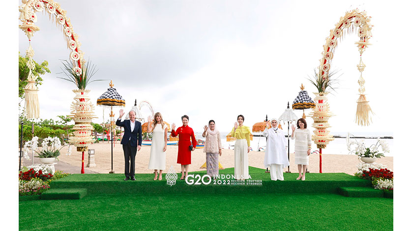 當地時間11月15日上午,國家主席習近平夫人彭麗媛在巴厘島出席印度尼西亞總統夫人伊莉亞娜組織的二十國集團領導人第十七次峰會領導人配偶活動。這是彭麗媛同其他領導人配偶以海天為背景集體合影。 新華社
