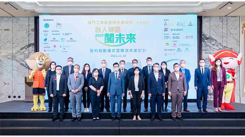 「『融入灣區闖未來』廣州簽約啟動儀式暨穗澳商業配對洽談會」昨(18)日假美獅美高梅舉行,主禮嘉賓包括澳門貿易投資促進局執行委員李藻森、教育及青年發展局青年廳廳長張敏輝、生產力暨科技轉移中心高級經理李藹倫、美高梅總裁、首席戰略及財務官馮小峰、澳區全國人大代表、澳門工商聯會會長何敬麟、執行會長吳華威,以及理事長歐家威。