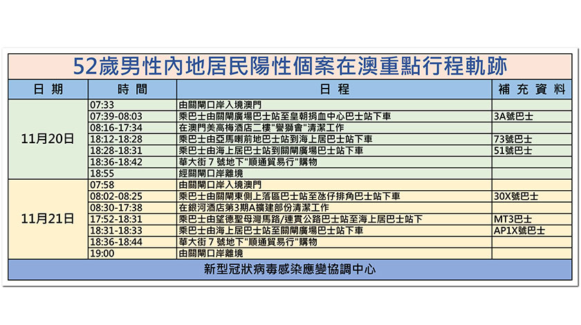 昨午約一時,新型冠狀病毒感染應變協調中心發出新聞稿表示,昨早接獲珠海通報一宗陽性病例──五十二歲男性內地居民,居住在珠海,在澳門任職清潔工作。十一月十八、十九、廿日核檢為陰性,廿一日核檢結果呈陽性。