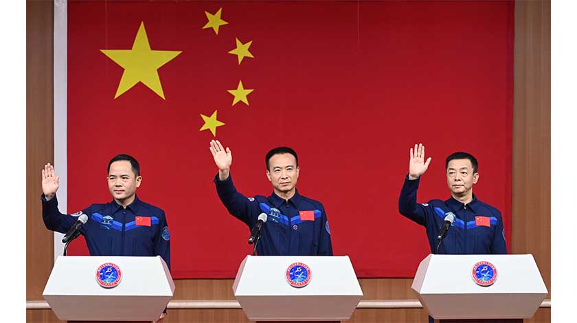 11月28日,執行神舟十五號載人飛行任務的航天員乘組費俊龍(中)、鄧清明(右)、張陸在酒泉衛星發射中心問天閣與中外媒體記者集體見面,並回答記者提問。 中新社