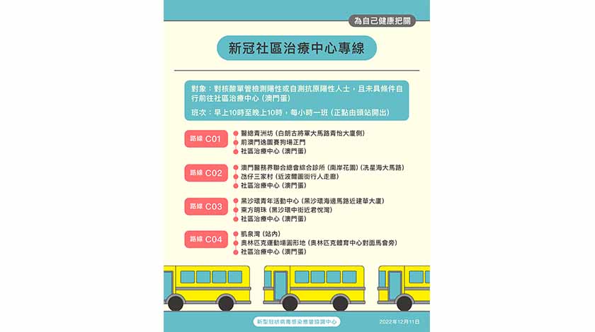 【特訊】新型冠狀病毒感染應變協調中心表示,為方便新冠感染者前往社區治療中心(澳門蛋)就診,將於今明兩天安排8個接載點的巴士專線,乘坐對象為對核酸單管檢測陽性或自測抗原陽性人士,且未具條件自行前往社區治療中心(澳門蛋)。其後將於周三(12月14日)增設更多接載點接送新冠感染者到各社區門診就診。