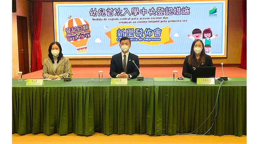 教青局昨舉行新聞發佈會,介紹二零二三/二零二四學年幼兒首次入學中央登記措施的具體安排。教青局非高等教育廳廳長張子軒、小學及幼兒教育處處長蔡敏芝及資訊及科技處處長黎玉燕出席發布會。