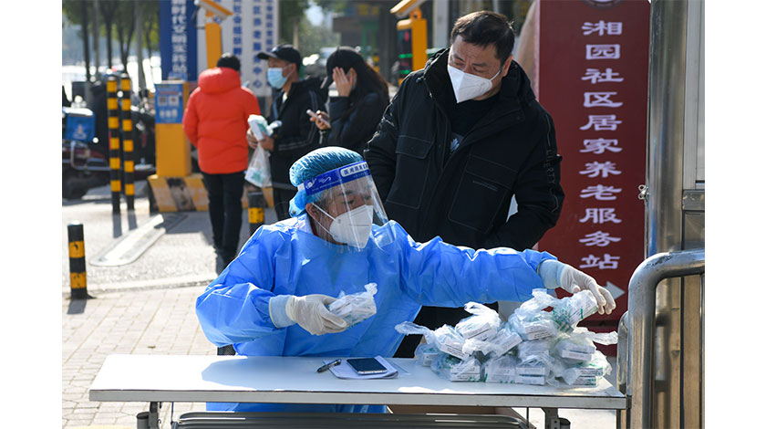 湖南省長沙市天心區青園街道社區衛生服務中心的醫護人員整理防疫健康包。當日,長沙眾多社區衛生服務中心免費向市民發放防疫健康包。首批防疫健康包約10萬份,每份包含退熱藥9片、抗原檢測試劑2個。 中新社