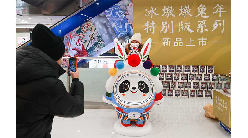 12月28日,“北京2022冰墩墩兔年特別版系列”在北京發佈。此次系列新品是以北京傳統民俗中的經典兔子形象“兔爺”為創意點,形成具有民族特色的“兔墩墩”。圖為買到“兔墩墩”的市民打卡拍照。( 中新社)