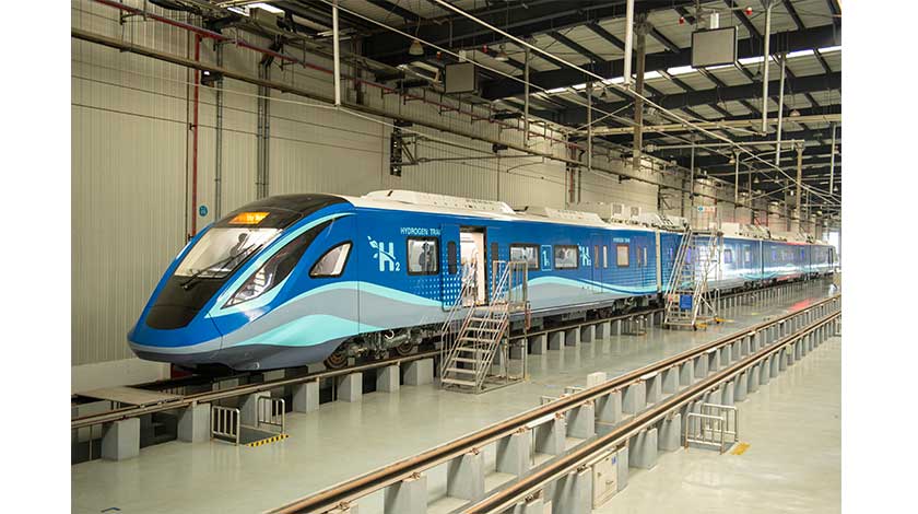 12月28日,全球首列氫能源市域列車在四川成都正式下線。該列車內置“氫能動力”系統,最高時速160公里,加氫一次可實現續航600公里。圖為生產線上的氫能源市域列車。 (中新社)