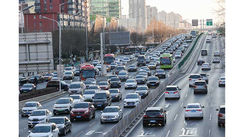 1月3日早高峰時段,北京國貿地區車流集中。當日是2023年首個工作日。 中新社
