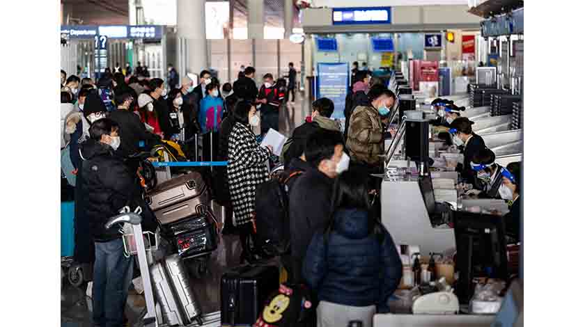 1月8日,旅客在北京首都國際機場T3航站樓日本航空公司的值機櫃檯排隊等待辦理登機手續。當天起,中國對新冠病毒感染實施“乙類乙管”,根據國際疫情形勢和各方面服務保障能力,有序恢復中國公民出境旅遊。 中新社