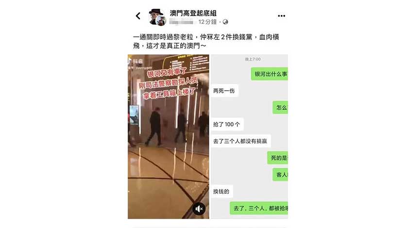 涉案內地男子姓楊、四十四歲、報稱商人。本月八日,網上社交平台流傳一則司警在路氹某酒店執法過程片段,並配以文字指「銀河又出事,剛見到司法警察拿著工具箱上了樓」,又指「本澳恢復免檢通關後,隨即發生涉及換錢黨的搶劫命案,並造成兩死一傷,血肉橫飛」。