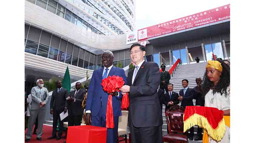 1月11日,在埃塞俄比亞首都亞的斯亞貝巴,中國外交部長秦剛(中右)與非盟委員會主席法基(中左)出席非洲疾控中心總部項目竣工儀式。新華社