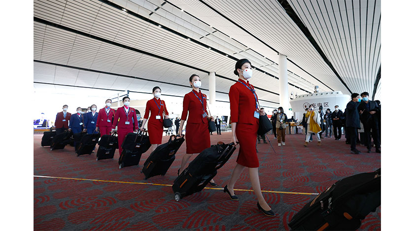 1月17日9時,中國南方航空CZ309航班從北京大興國際機場啟程飛往香港。這是近3年來,大興機場首架國際及港澳台地區客運航班,標誌著大興機場國際及港澳台地區客運航線正式恢復。圖為機組人員登機。(中新社)