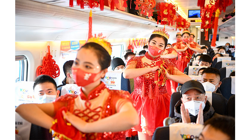 臨近春節,中國鐵路蘭州局集團有限公司銀川客運段將部分列車車廂裝扮一新,組織青年職工在列車上表演自編的節目,為旅客送上小禮物,讓人們將旅途中的歡樂帶回家。(新華社)