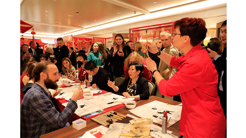 當地時間1月20日,由中國文化和旅遊部與中國駐俄羅斯大使館聯合主辦的『歡樂春節——中國文化廟會』開幕式在莫斯科舉行。圖為文創展示區,俄羅斯畫家現場講解中國國畫用筆基礎技法。 中新社
