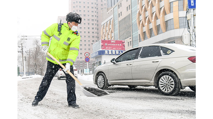 1月21日,在位於烏魯木齊市的北園春副食海鮮市場附近,民警阿拉法特•胡加何買提在路面上拋灑爐渣,以防車輛打滑。