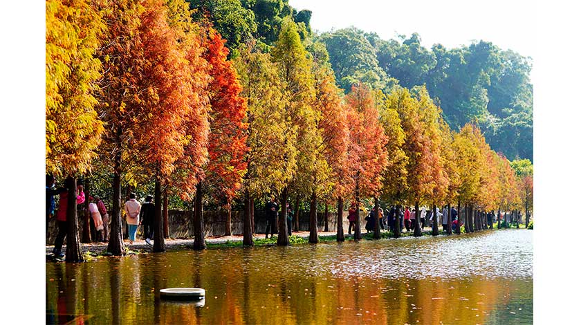 台灣桃園大溪月眉落羽松。3每年過年期間,就是賞落羽鬆的季節,台灣桃園落羽松最新景點“大溪月眉落羽松”,圍著月眉人工濕地生態池種植的大片落羽松,漸漸的轉黃轉紅,愈來愈美麗,成了近來爆紅的旅遊景點,不僅僅平日就已經又滿滿的人潮,假日更是遊覽車一部接著一部的載來絡繹不絕的遊客!黃紅相間的落羽松環繞著池畔,倒影映在池面上,就彷佛置身歐洲美麗的風景般,跟山水油畫沒兩樣。(香港中通社)