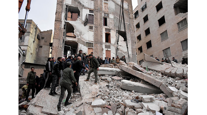 2月6日,人們在敘利亞阿勒頗省一處倒塌的建築現場進行救援。土耳其南部靠近敘利亞邊境地區6日發生強烈地震,敘北部主要城市阿勒頗多處房屋垮塌。新華社