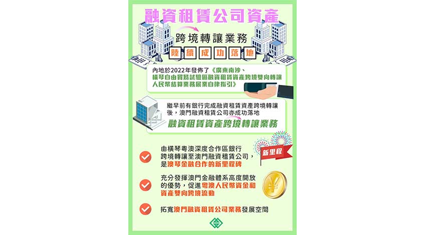 為促進及推動澳門現代金融業的發展,金管局與內地相關部委持續跟進溝通爭取支持。2022年4月,內地發佈《廣東南沙、橫琴自由貿易試驗區融資租賃資產跨境雙向轉讓人民幣結算業務展業自律指引》,允許廣東南沙和橫琴自貿區內銀行,與包括澳門在內的境外機構,跨境雙向轉讓融資租賃資產,並以人民幣進行跨境結算,助力擴大澳門融資租賃業務的規模。