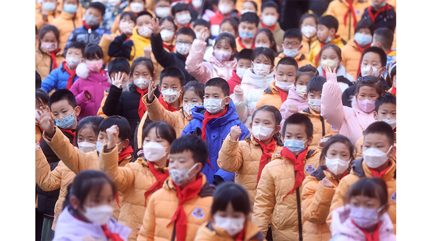 2月13日,北京市豐台區怡海小學,學生們在開學典禮上同唱“一起向未來”。當日,北京市160餘萬中小學生重返校園,迎來新學期。 中新社