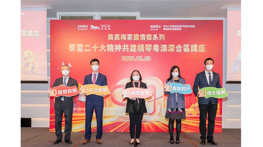【特訊】適逢中國共產黨第二十次全國代表大會勝利召開,美高梅日前舉行「美高梅家國情懷系列 – 學習二十大精神共建橫琴粵澳深合區講座」,邀請到澳區全國人大代表、全國港澳研究會理事、澳門發展策略研究中心會長蕭志偉;以及中國人民政治協商會議廣東省委員會委員、第五屆澳門特別行政區行政會委員、澳門街坊會聯合總會理事長陳家良,為團隊成員闡釋二十大報告的重點內容,並探研如何將二十大的精神貫徹落實於橫琴粵澳深合區的建設發展之中,推動澳門更好融入國家發展大局。講座獲中央人民政府駐澳門特別行政區聯絡辦公室經濟部作指導單位。出席活動的主禮嘉賓包括中央人民政府駐澳門特別行政區聯絡辦公室經濟部助理趙速;博彩監察協調局博彩研究及聯絡廳廳長杜子柔;兩位講者蕭志偉及陳家良;以及美高梅人力資源執行副總裁余婉瑩。兩位主講嘉賓引用報告內容指出,二十大是在全黨全國各族人民邁上全面建設社會主義現代化國家新征程、向第二個百年奮鬥目標進軍的關鍵時刻所召開的一次十分重要的大會。二十大報告的十五個篇章,內容豐富,催人奮進,總結黨和國家過去五年工作和新時代十年的偉大變革,清晰指明了中國新時代的前進道路,規劃了中國式現代化發展的宏偉藍圖。蕭志偉寄語澳門社會各界必須「學懂、弄通、做實」二十大報告的新思路、新戰略、新舉措,結合到澳門自身發展之中,發揮澳門所長,全面推進橫琴粵澳深度合作區的高質量發展,並把握好大灣區帶來的機遇,積極融入國家發展戰略,為中國式現代化建設和中華民族偉大復興邁進新征程作出貢獻。陳家良表示,喜見澳門的施政報告,提出促進四大新興產業之一的高新科技,並將科創融入教育政策。他寄語各界凝聚團結力量,共同為國家實現第二個百年奮鬥目標。