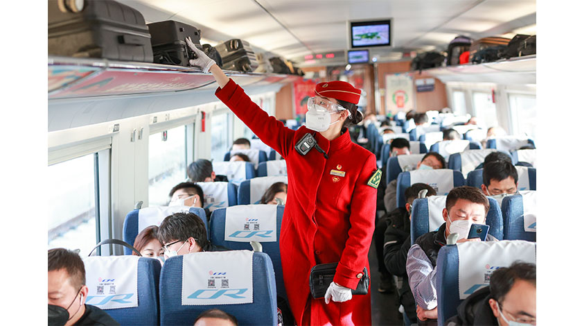 2月15日,從唐山開往北京的G8806次列車內,列車長巡視車廂並檢查行李是否擺放安全。當日是2023年春運的最後一天,為期40天的春運正式落幕。 中新社