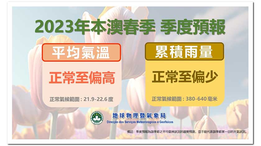 【本報訊】地球物理暨氣象局發布二○二三年本澳春季(3月至5月) 氣候預報,預料平均氣溫屬於正常至偏高,整季累積雨量屬於正常至偏少。