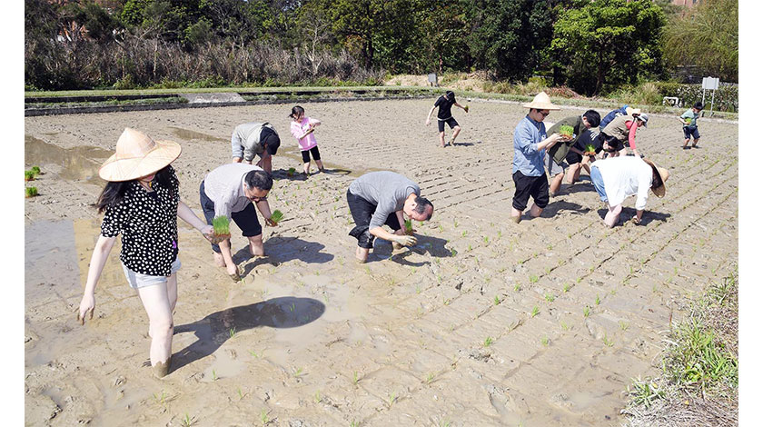 台北都會區體驗春耕活動。台灣大學延續傳統,在位於台北都會區的校總區內1.7公頃的農田種植水稻,3月5日由校友們帶著家人頭戴斗笠、赤腳下田,體驗在寸土寸金的台北都會區中的農耕文化。(香港中通社)