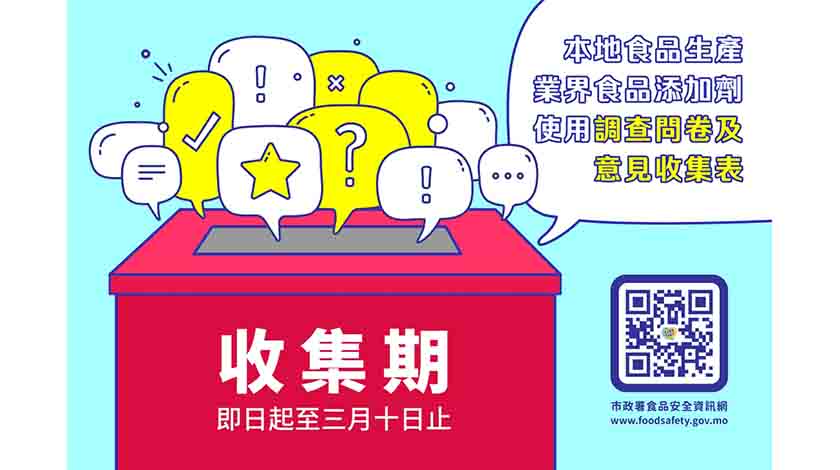 為方便更多食品業界發表意見,市政署已於食品安全資訊網 www.foodsafety.gov.mo 上載《食品添加劑使用調查問卷及意見收集表》,下載及填妥後可電郵至fsconsult@iam.gov.mo或傳真至8296 1204提交,亦可致電食安專線2833 8181直接發表意見,收集期將於三月十日結束,歡迎業界踴躍發表意見。