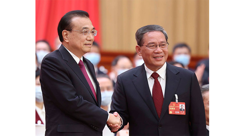 3月11日,十四屆全國人大一次會議在北京人民大會堂舉行第四次全體會議,根據國家主席習近平的提名,經過投票表決,決定李強為中華人民共和國國務院總理。圖為李強同李克強握手。中新社
